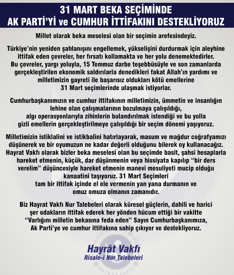 Biz Hayrat Vakfı Nur Talebeleri olarak küresel güçlerin, dahilî ve haricî şer odakların ittifak ederek her yönden hücum ettiği bir vakitte “Varlığını milletin bekasına feda eden” Sayın Cumhurbaşkanımıza, Ak Parti’ye ve cumhur ittifakına sahip çıkıyor ve destekliyoruz.