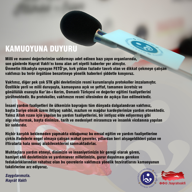 Milli ve manevi değerlerimize saldırmayı adet edinen bazı yayın organlarında, son günlerde Hayrat Vakfı’nı konu alan art niyetli haberler yer almıştır. Ümmetin itikadıyla oynayan FETÖ’ye, kırk yıldan fazladır tavırlı olan ve dikkat çekmeye çalışan vakfımızı bu terör örgütüne benzetmeye yönelik haberleri şiddetle kınıyoruz.