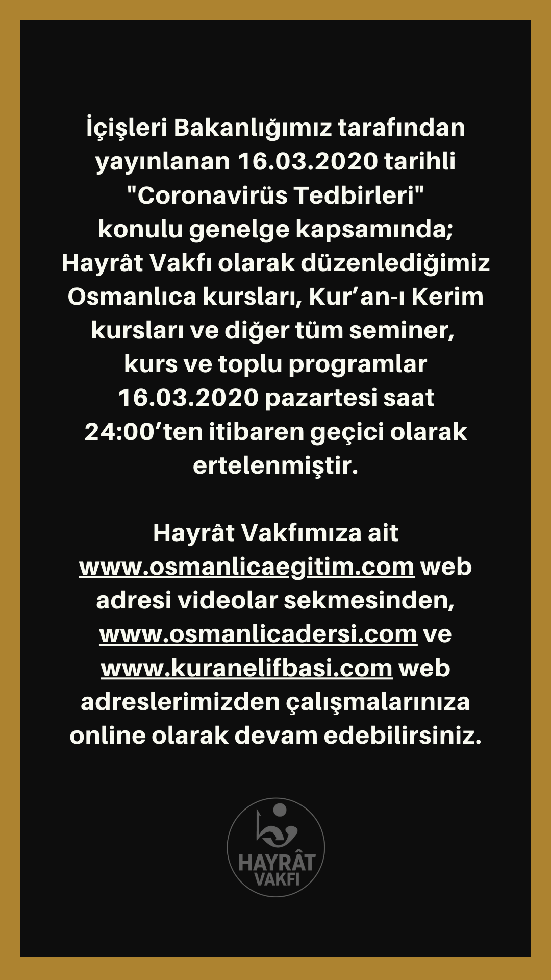 İçişleri Bakanlığımız tarafından yayınlanan 16.03.2020 tarihli “Coronavirüs Tedbirleri” konulu genelge kapsamında; Hayrât Vakfı olarak düzenlediğimiz Osmanlıca kursları, Kur’an-ı Kerim kursları ve diğer tüm seminer, kurs ve toplu programlar 16.03.2020 pazartesi saat 24:00’ten itibaren geçici olarak ertelenmiştir.