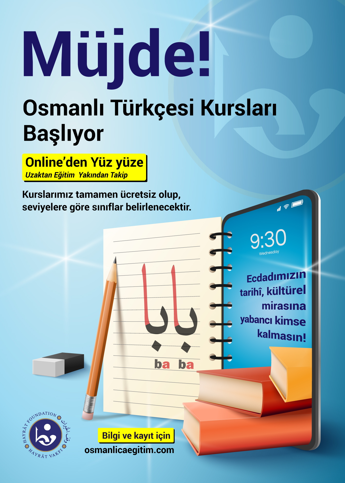 Hayrat Vakfı tarafından düzenlenen Osmanlı Türkçesi kursları, yeni senede uzaktan eğitim, bire bir iletişimle başlayacak. Alınacak kayıtlara göre 25 Ocak’ta sınıflar oluşturulacak ve öncesinde kursiyerlere kısa mesajla bilgi verilecektir.