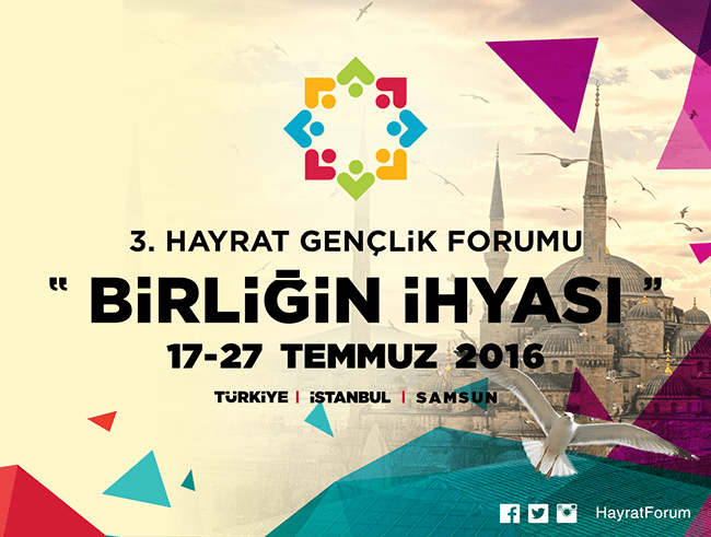İslam Dünyasındaki genç kardeşlerimizin birlik şuurunu kuvvetlendirebilmek adına Hayrat Uluslararası Öğrenci Derneği olarak ‘İslam Medeniyetinin İzinde’ sloganıyla her yıl tertip ettiğimiz 3. Hayrat Gençlik Forumunun bu yılki başlığını ‘Birliğin İhyası’ olarak belirledik. Bu çerçevede Hayrat Gençlik Forumu, sahalarında uzman konuşmacıların katılımıyla ve İslam Dünyasının 40 farklı ülkesinden 120 gencin bir araya gelmesiyle 17-27 Temmuz tarihlerinde Samsun’da icra edilecektir.