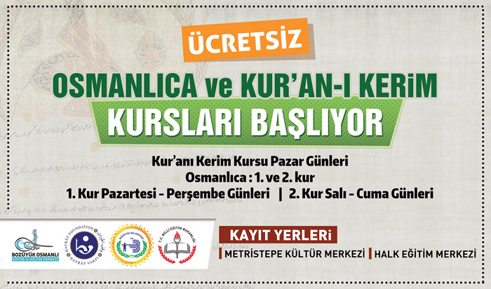 Bozüyük Belediyesi, Bozüyük Osmanlı Kültür ve Eğitim Derneği, İlçe Milli Eğitim Müdürlüğü ve Hayrât Vakfı işbirliği ile ücretsiz olarak düzenlenen Kur’an-ı Kerim ve Osmanlıca Kursları Metristepe Kültür Merkezi’nde yapılacak. 21 Mart 2016 Pazartesi günü başlayacak dersler 6 hafta sürecek. Kur’an-ı Kerim kursları Pazar günleri verilirken Osmanlıca’nın 1. kur dersleri Pazartesi ve Perşembe günleri, 2. Kur dersleri ise Salı ve Cuma günleri verilecek.