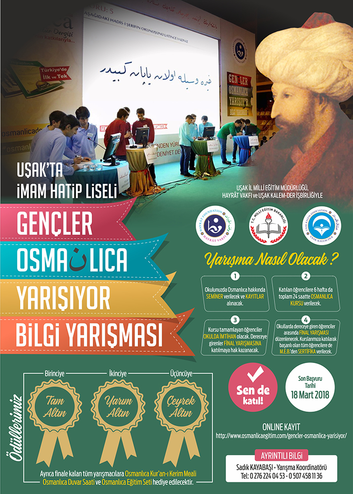 Uşak’taki İmam Hatip liselerinde öğrenim gören öğrenciler arasında Uşak Milli Eğitim Müdürlüğü, Hayrat Vakfı Uşak Temsilciliği ve Uşak Kalem-Der tartından Osmanlıca Bilgi Yarışması yapılacaktır.