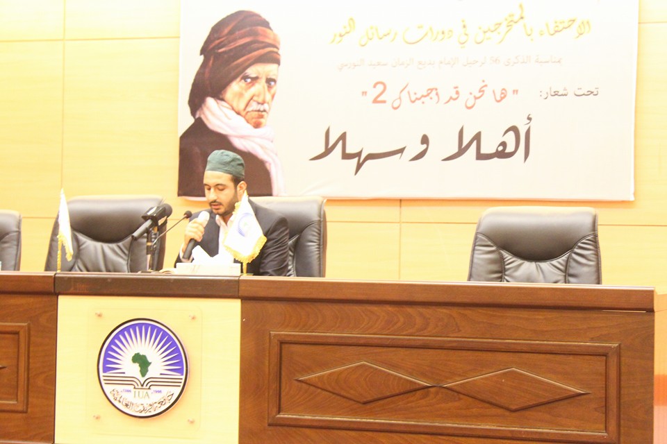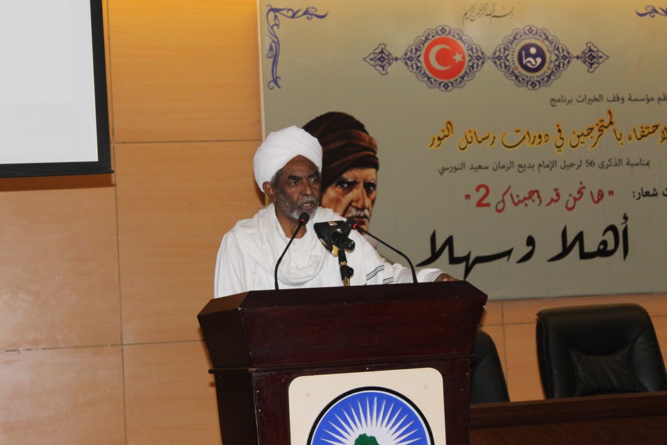 ‘Bu oturumda sizlerle birlikte olmaktan şeref duyuyorum. Ben sudanda ve Türkiye’de Risale-i Nurlardan çok istifade ettim. Hiç şüphe yok ki Bediüzzaman Said Nursi asrımızın imamıdır. Kuran ayetlerini asrımızın ihtiyaca en uygun bir şekilde bize tefsir eyledi. Bediüzzaman, Bizim bu asırda en çok ihtiyacımız olan Fen ilimleri ile dini ilimleri birleştirmiştir. Bizler yıllardır medreselerde sadece dini ilimleri tahsil ettirmekteyiz ama Bediüzzamanın metoduna baktığımızda her ikisinin beraber okutulması gerektiğini görmekteyiz. Sudan’da ve Türkiye’de Risale-i Nur talebeleriyle görüştüm başta Hayrat vakfı başkanı, Bediüzzaman Hazretlerinin ve Hüsrev Üstadımızın başlattığı hizmeti devam ettiren muhterem Said Nuri Ertürk hoca ile kendisi tam bir Salih kul ve Allah dostlarından olduğunu, ve Risale-i Nur talebelerinin de Kuran ve sünnetin kendilerinde mücessem hale geldiğini müşahede ettim’. Ve son olarak şunu söylemek istiyorum bu kıymetli çalışmaların karşılığı bu dünyada hiçbir şekilde verilemez. Kuran hizmetinde ve ümmetin savunma noktasında özellikle gençlerin büyük bir gayretle yaptıkları bu çalışmalar. Sadece İslamiyet’e değil bilakis bütün insanlığadır’’ dedi.
